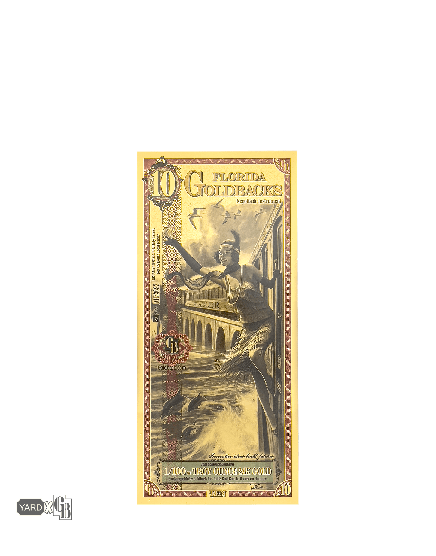 The Florida Ten Goldback highlights the virtue “Innovatio” (Innovation), depicted as a spirited flapper riding the Florida East Coast Railway (FEC). This artwork celebrates the railway’s transformative role in Florida’s development, which Henry Flagler expanded southward through the engineering marvel of the Overseas Railroad, reaching Key West by 1912.