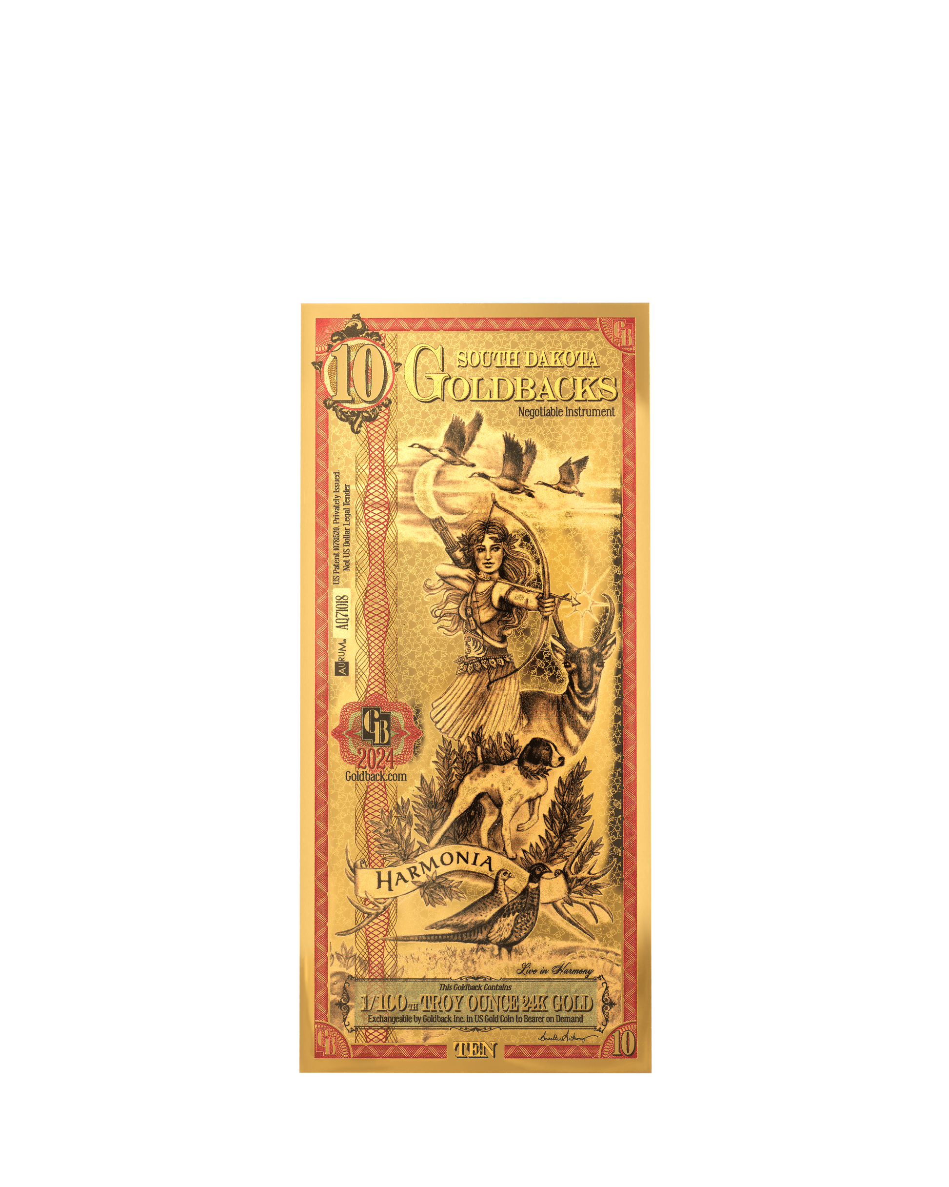 The Virtue Harmonia, or Harmony, makes her debut on the South Dakota 10 Goldback Denomination. Accompanied by the phrase “Live in Harmony” , Harmonia appears as a modern interpretation of the Greco-Roman Artemis, the goddess of the hunt, the wilderness, fertility, and young women. As such, she is surrounded by many symbols of those things. She holds a drawn bow, with an arrow on the string, ready to release. Behind her, a crescent moon rises in a cloudy sky, a symbol of healing and light in the darkness. Around her are depictions of Canada geese, a pronghorn antelope, mule deer antler sheds, and ring-necked pheasants, representing just some of the animals that make South Dakota a world renowned hunting destination in the United States.