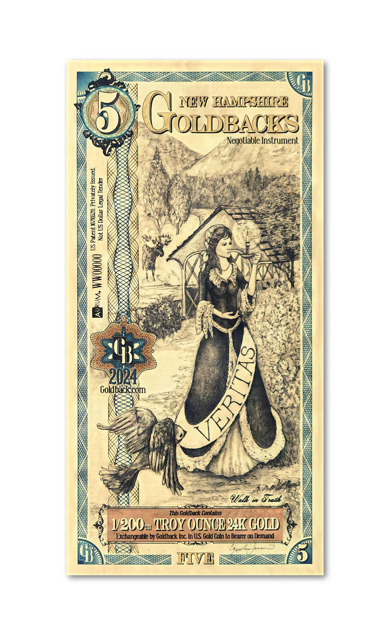 New Hampshire’s 5 Goldback design is the second time that Veritas, or Truth, makes an appearance. She is depicted here wearing a colonial dress, offering the light of a candle, and walking along a path that leads to a covered bridge over a foggy river. She symbolizes the light of truth and offers that light to others, beckoning them to come toward her and follow the path that leads them safely through the fog of obscurity and confusion that is their demise without her light. The covered bridge is patterned after one that can be found along the Kancamagus Highway, though similar covered bridges can be found all around the state. On Truth’s left is a purple lilac bush, the state flower, and on her right is a purple finch, the state bird, and below her is the caption “Walk in Truth” .