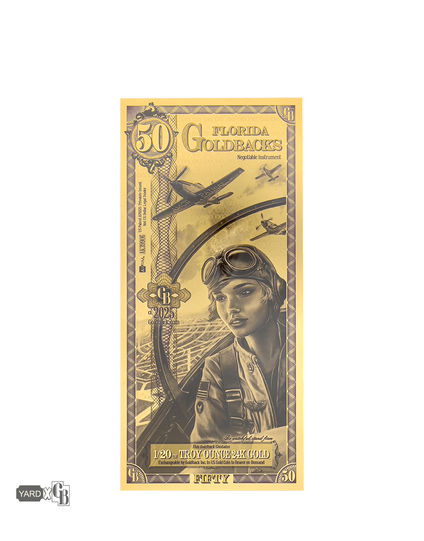 The Florida 50 Goldback presents the virtue “Amor Patriae” (Love of Country) through the depiction of a Women’s Airforce Service Pilot (WASP). The young pilot flies a P-51 Mustang over Hendricks Army Airfield, symbolizing bravery and dedication.