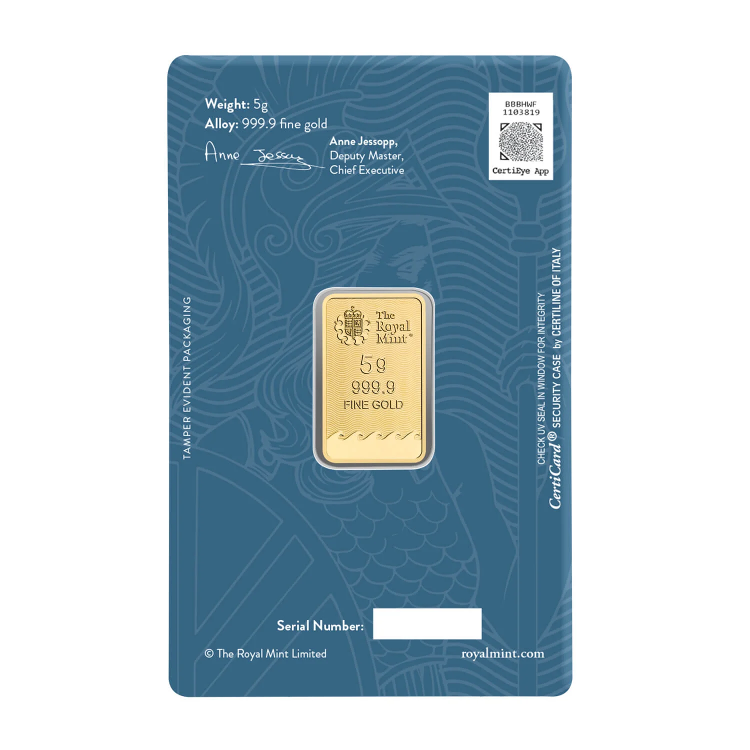 This 5 gram gold bar from The Royal Mint features the Britannia design. It is made of 999.9 fine gold and comes in tamper-evident packaging for authenticity.